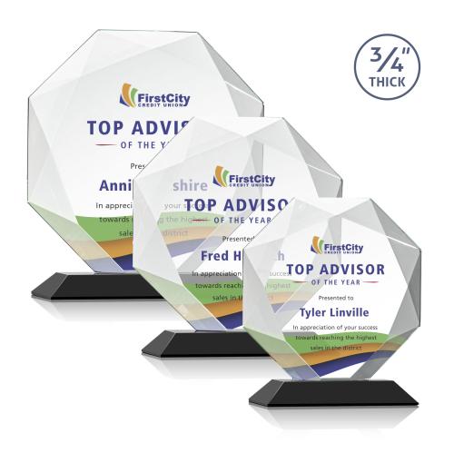 Spectacular Multifaceted 0.75" Thick Starfire Octagonal Award with deep recessed bevels forming a striking diamond design. Mounted on a mitered Black Crystal Base. Let your message POP with full-color VividPrint!