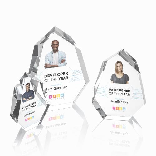 This extra-thick Optical Crystal freestanding work of recognition art makes a bold statement when awarded to a deserving recipient. with dramatic interchanging bevels, the Norwood award will refract light in every direction to create a sparkling spotlight around your recognition message.