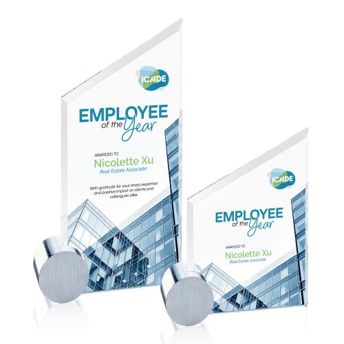 The Cooper VividPrint Award features a slant-topped 3/8" thick starfire crystal upright with beveled edges, supported by an aluminum corner disk or star holder in either gold or silver finish.