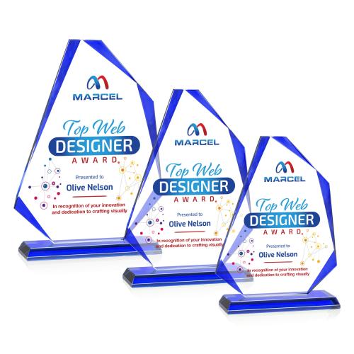 The Hillmont VividPrint Award, crafted from brilliant Starfire crystal, features an abstract polygon design with striking colored edges that seamlessly match its sturdy base. Perfect for honoring top achievers and industry leaders, this award embodies excellence and innovation. The award is available in sapphire, emerald, ruby, or gold.