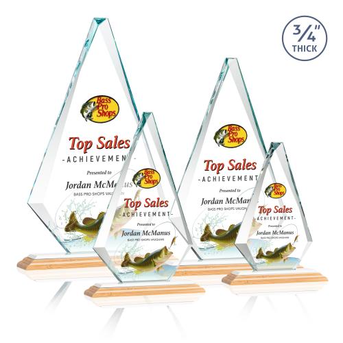 The exquisite Windsor VividPrint Award features a 0.75" thick Starfire Crystal diamond with sparkling bevels and is mounted on a triple-stepped bamboo base. A classic design that's perfect for corporate recognition. Take your artwork to new heights with full-color VividPrint! Various other bases are available!