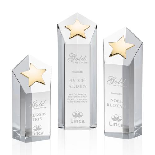 Sleek Optical Crystal features a gleaming Gold Cast Metal Star. The perfect award to recognize a Star Performance. Also available in Silver.