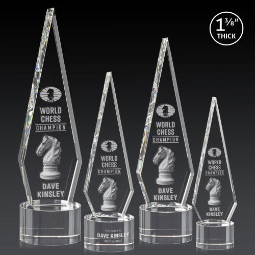 This Optical Crystal Springfield 3D Award on base features an elongated, tall diamond-shape, standing **1 3/8 inches thick.** The sleek design exudes elegance and sophistication, making it an eye-catching centerpiece for any display. Its flawless clarity and precision-cut edges reflect light beautifully, highlighting the craftsmanship and significance of the accolade. Bring recognition to life with 3D engraving! Available with various bases. 2nd position etching optional.
