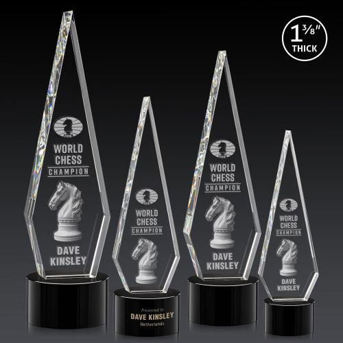 This Optical Crystal Springfield 3D Award on base features an elongated, tall diamond-shape, standing **1 3/8 inches thick.** The sleek design exudes elegance and sophistication, making it an eye-catching centerpiece for any display. Its flawless clarity and precision-cut edges reflect light beautifully, highlighting the craftsmanship and significance of the accolade. Bring recognition to life with 3D engraving! Available with various bases. 2nd position etching optional.