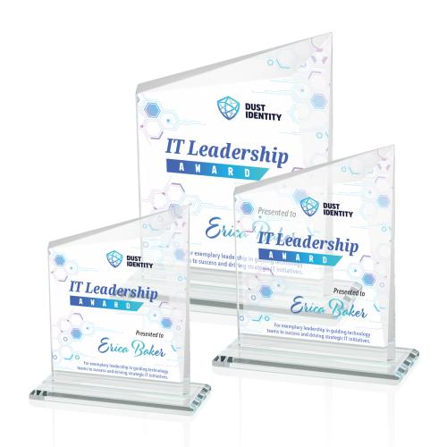 A gorgeous panel of Starfire glass with a striking bevel framing its peaked edge, mounted on a gleaming optical crystal beveled base for an added touch of elegance and brilliance. This exquisite combination enhances both clarity and presence, making it a standout choice for premium recognition and display. Elevate your artwork with full-color VividPrint.