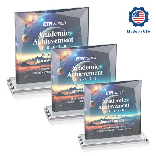 Brilliant VividPrint award in 3 sizes features a 0.75" thick Starfire Crystal and deep divergent bevels to create a striking work of recognition. Mounted on a thick mitered base. Elevate your artwork with full-color VividPrint!