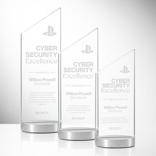 The Islington Award showcases a sleek, modern design with a crisp top-right facing peak, symbolizing upward achievement and forward momentum. Crafted from luminous Starfire crystal, it offers exceptional clarity and elegance, perfect for highlighting your custom message. Mounted on a round aluminum base, this award brings a contemporary touch to any recognition moment.