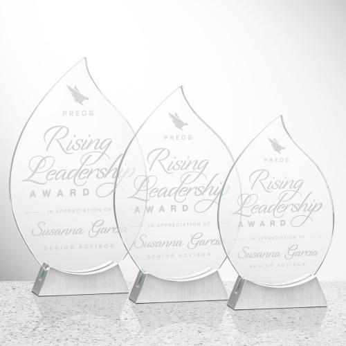 The stunning starfire crystal Carmack Award features a graceful flame/teardrop shape, symbolizing inspiration, growth, and achievement. Mounted on a sleek brushed aluminum base, it combines modern elegance with timeless design. Perfect for honoring rising leaders, top performers, or milestone accomplishments, this award leaves a lasting impression of prestige and recognition.