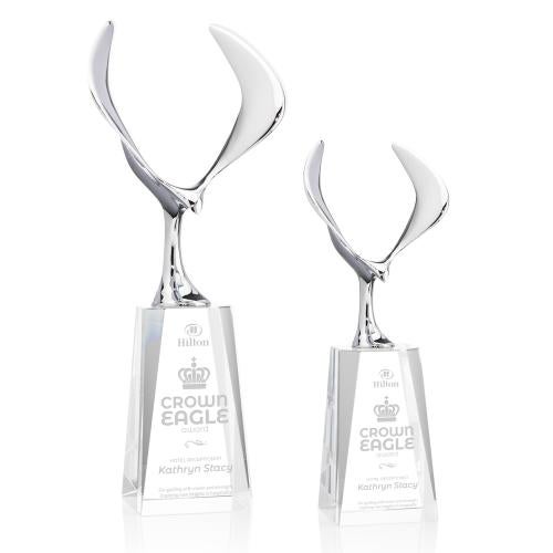 The Maverick Eagle Award showcases a soaring chrome eagle, a bold symbol of vision, freedom, and achievement. Its dynamic wingspan is elevated by a choice of elegant Optic Crystal bases, available in various shapes and finishes to suit any recognition style. This striking award makes a powerful statement, celebrating excellence with both strength and sophistication.
