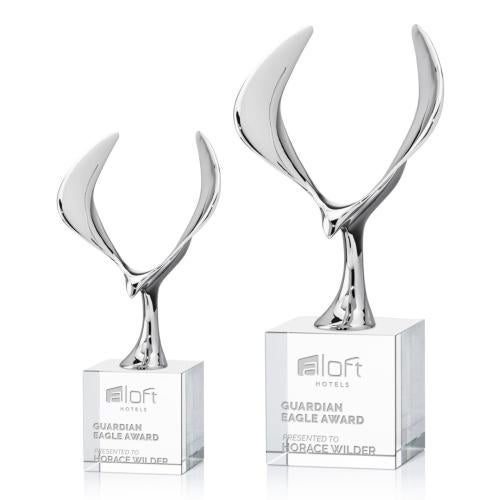 The Maverick Eagle Award showcases a soaring chrome eagle, a bold symbol of vision, freedom, and achievement. Its dynamic wingspan is elevated by a choice of elegant Optic Crystal bases, available in various shapes and finishes to suit any recognition style. This striking award makes a powerful statement, celebrating excellence with both strength and sophistication.