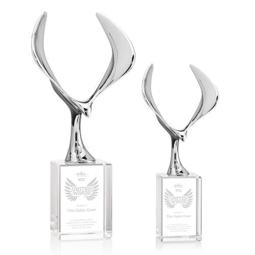 The Maverick Eagle Award showcases a soaring chrome eagle, a bold symbol of vision, freedom, and achievement. Its dynamic wingspan is elevated by a choice of elegant Optic Crystal bases, available in various shapes and finishes to suit any recognition style. This striking award makes a powerful statement, celebrating excellence with both strength and sophistication.