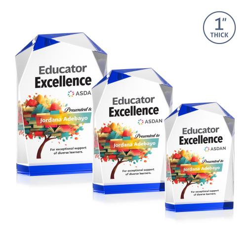 The elegant freestanding Donvale VividPrint award features a modern geometric design with beveled edges and a vibrant sapphire accent at the base that reflects throughout the top bevels. Crafted from optical crystal, its asymmetrical angles catch the light beautifully, creating a striking visual effect. Available in three sizes, it's perfect for recognizing excellence with a sophisticated and contemporary touch. Bring your artwork to life with full-color VividPrint!