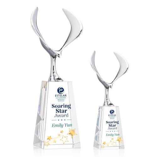 The Maverick Eagle VividPrint Award showcases a soaring chrome eagle, a bold symbol of vision, freedom, and achievement. Its dynamic wingspan is elevated by a choice of elegant Optical Crystal bases, available in various shapes and finishes to suit any recognition style. This striking award makes a powerful statement, celebrating excellence with both strength and sophistication. Bring your design to life with brilliant full-color VividPrint, adding depth and vibrancy to every detail of your artwork.