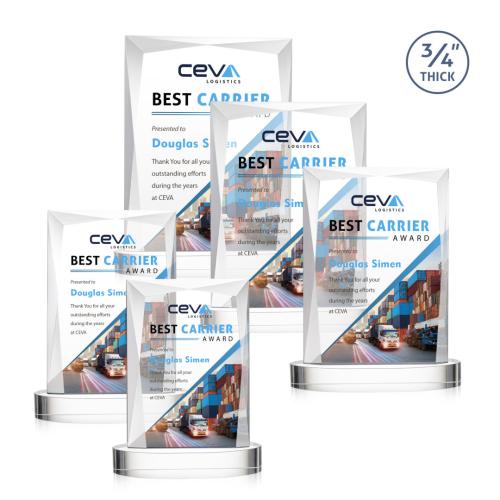 A staple of the recognition industry, the Messina on Alberton Base is a striking award in thick 3/4" Starfire Crystal mounted on clear or colored base. Featuring brilliant interchanging bevels that create a beautiful frame of refracting light for your special achievement. Let your message POP with full color VividPrint!