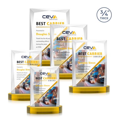 A staple of the recognition industry, the Messina on Alberton Base is a striking award in thick 3/4" Starfire Crystal mounted on clear or colored base. Featuring brilliant interchanging bevels that create a beautiful frame of refracting light for your special achievement. Let your message POP with full color VividPrint!
