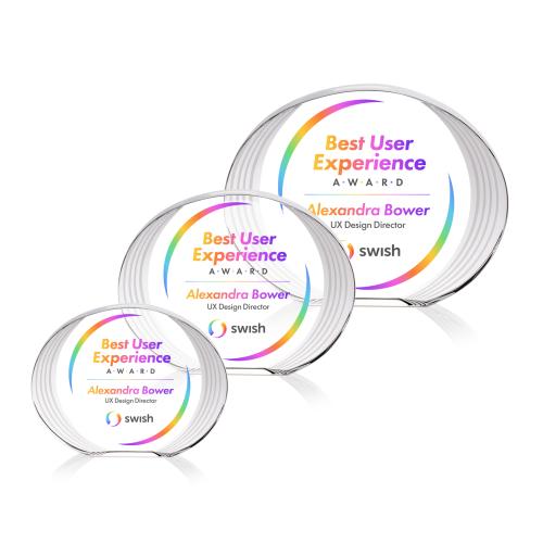 The Sheraton Oval VividPrint Award showcases a sleek, freestanding oval design with a subtly concaved shape and a striped, ridged edge that draws attention to the imprint area. Its layered detailing creates depth and visual interest, elegantly framing your personalized message or logo. Refined and contemporary, this award is a striking way to recognize achievement with modern style.
