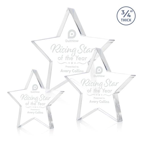 The Esna Star Award is a freestanding, .75″-thick Starfire crystal award featuring a bold star silhouette with precision-cut edges that reflect light with striking brilliance. Its substantial crystal design conveys achievement and forward momentum, making it ideal for recognizing standout performance and rising talent. Available with clear, gold, emerald, ruby, or sapphire accents, this award offers a polished way to celebrate excellence with lasting impact.