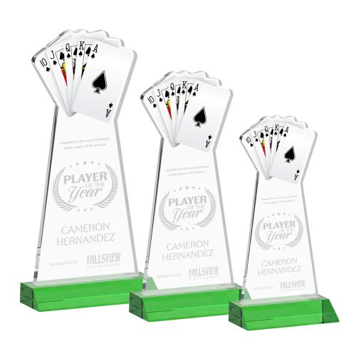 The Poker Award is crafted from premium Starfire Crystal and features a detailed deck-of-cards cutout at the top, complete with a vibrant imprinted card design for striking visual impact. Mounted on a precision front mitered base, the clear crystal construction delivers brilliant clarity and a refined, contemporary presence. Perfect for tournaments, casino-themed events, and player recognition, this award is a winning tribute to standout performance. Second Position Etch & Colorfill Optional.