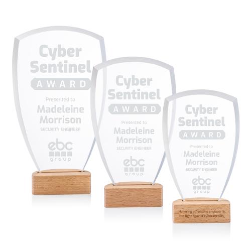 The Hendrick Award showcases modern elegance with its sleek Starfire crystal shield mounted on a smooth beechwood base. Its clear, luminous surface beautifully highlights both vibrant full-color designs and precision deep-etch. Perfect for recognizing excellence and innovation, this award combines natural warmth with contemporary sophistication.
