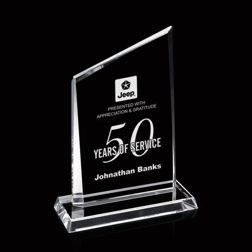 The three unequal sides of the 8" high, starfire glass Representative have tapered bevels - the top one on the back and the side ones, with opposite tapers, on the front. These prominent, asymmetric, and flaring bevels accentuate the sparkle of the glass, generate diverse and attractive reflections along the edges and frame the large central etching area. Also available in 9" and 10" versions and in jade glass.