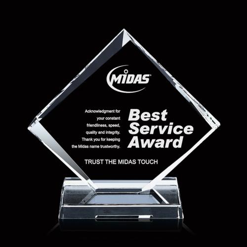 The 9" high, Starfire glass Regal features a four-sided diamond-shaped configuration with tapered bevels alternating front and back. The prominent, asymmetric and flaring bevels accentuate the sparkle of the glass, generate diverse and attractive reflections along the edges, and frame the large central etching area. Also available in 6" and 7.5" versions and in jade glass.