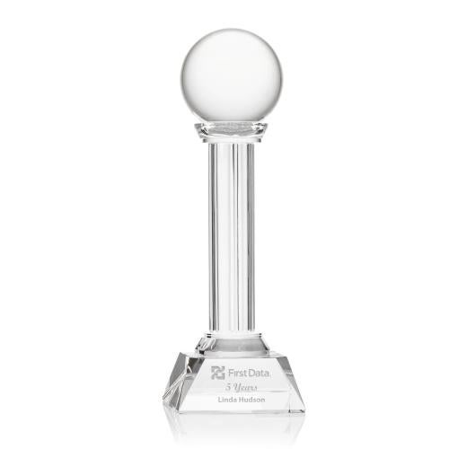 Stunning Optical Crystal award featuring a Clear Optical Sphere resting on a tall grooved Optical Crystal column. (Sphere not attached)