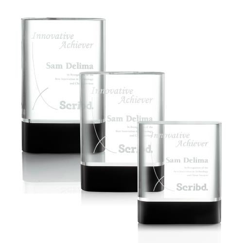 A bold freestanding clear and black optical crystal award with rounded sides.