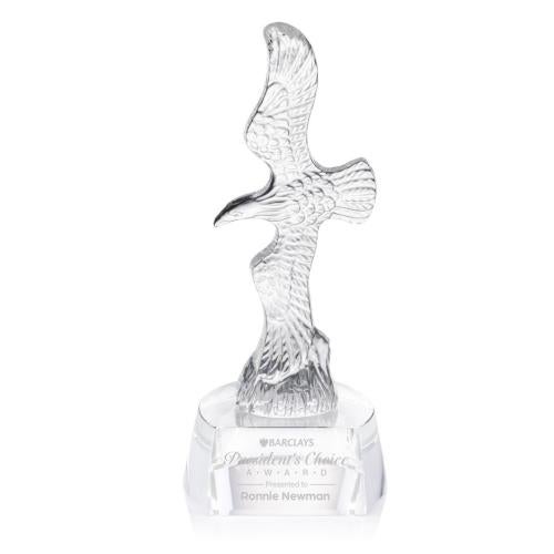 The Staffordshire Eagle on Base is a powerful award crafted in Optical Crystal, showcasing a finely detailed eagle in full flight with outstretched wings. Its striking design symbolizes strength, vision, and achievement, making it a commanding centerpiece for recognition. Available with a choice of elegant bases in blue, black, or clear crystal, it can be customized to suit any award presentation.