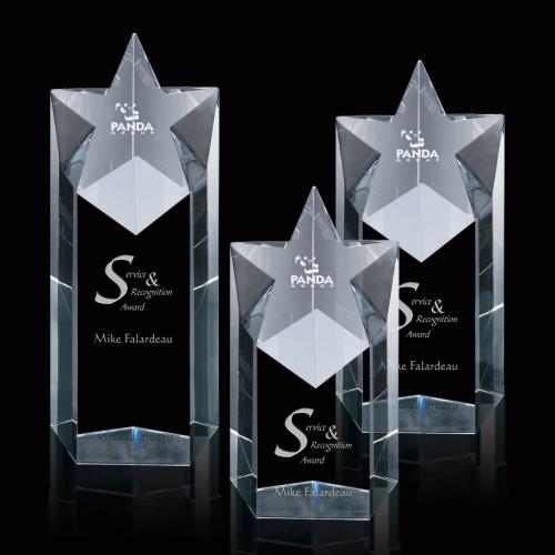 The Star Tower is a five-sided block of sparkling optical crystal. Deep angled cuts toward the top reveal a brilliant front-sloping star. An eye-catching, substantial award perfect for stellar performance and "rising stars".