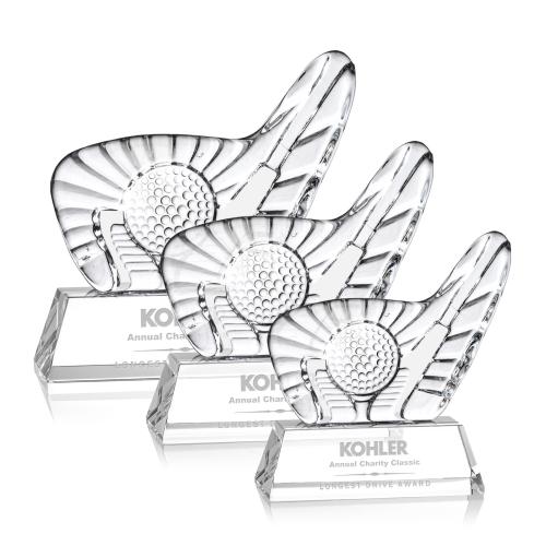 Stunning Thick Optical Crystal Iceberg shaped like a driver with a molded golf ball. Mounted on a 2" Optical Base. Available in 3 sizes.