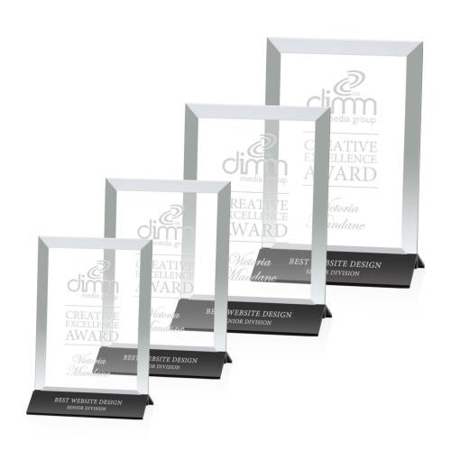 An elegant pane of starfire crystal is beveled, then mounted in a satin black powder coated aluminum base to construct this understated award of unparalleled beauty.