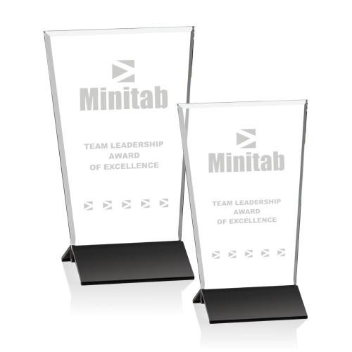 A tapered starfire crystal shape is beveled to reflect light and then mounted to a satin finished black aluminum base to create this stunning, artistic award.