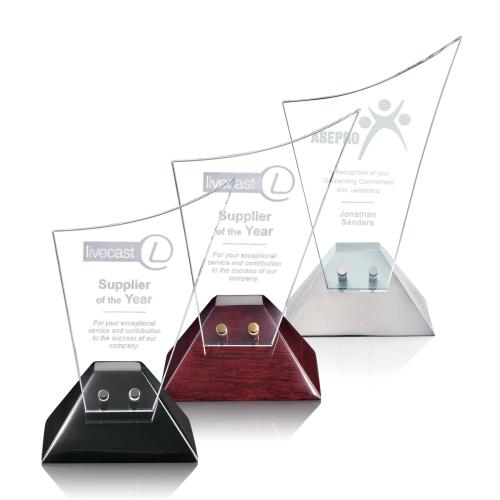 The Paloma Award features an upward sloping Starfire Crystal Crescent rising from a tapered base in Satin Nickel or Piano Finish Black or Rosewood. A dramatic award presentation for recognizing excellence.