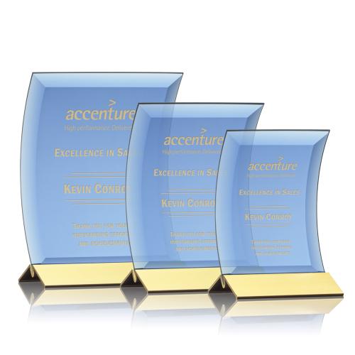 Blue Crescent award with deep bevels mounted on a brushed aluminum base. Available in 3 sizes gold or silver.