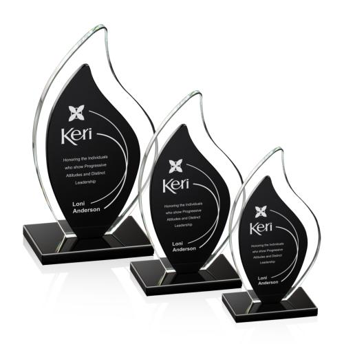 The clear and solid black crystal flame shape is mounted to a black crystal base to create an infinity reflection in the Flamingo award's brightly polished surface.