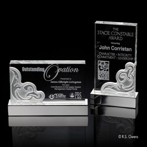 Multi-layered carved optical crystal glows with a luminous satin finish that is complimented by a thick polished aluminum base to create a dramatic contrast.