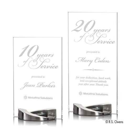 Cast metal bases hold hand-cut beveled glass reflecting a spectrum of light to surround your message of excellence.