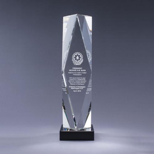 Allow achievements to shine brightly with our optic crystal Prizmas. These spectacular pieces feature bold geometric cuts and plenty of weight. Materials: Optic Crystal, Color Optic Crystal Decoration: Deep Etch, Digital Print, Color Fill
