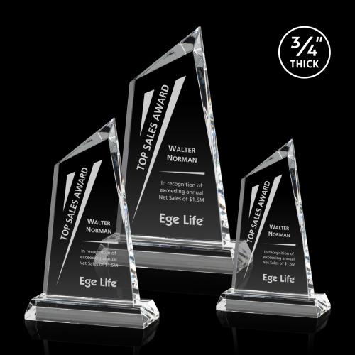 The Sandown Award is an amazing summit peak made of 3/4" thick Starfire Crystal. Masterfully designed, its corners feature beautiful bevels that frame the interior of the awards face.
