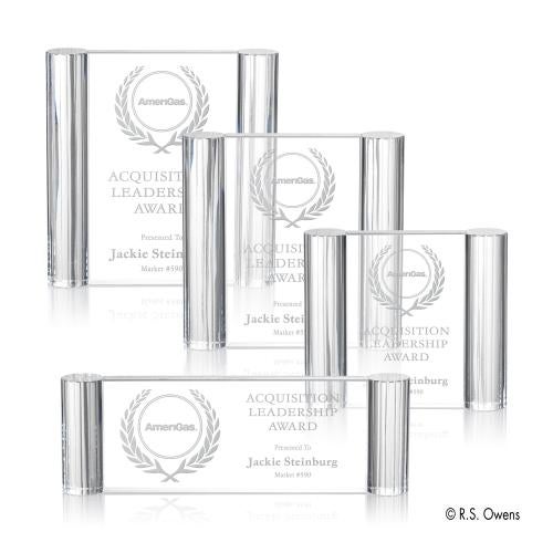 Deep grooved columns of optical crystal are fire polished to give classic elegance to these contemporary styled awards. The reflection from the ribbed column surface creates rainbow hues that surround the award with light.