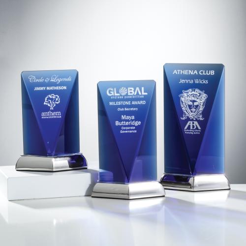 The deep optical crystal blue of the Rubicon Award tapers to narrow bevels which allow the edges to glow with graduated color and light. The base of mirror topped, brushed nickel finish metal base gives added sparkle to the inside of the crystal award.