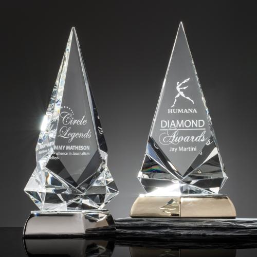 The Exalt is an extraordinary spear of optic crystal with deep cut bevels to form this exquisite sculpture. When light strikes its surface the thick and thin bevels create a rainbow glow. The award is mounted to a mirror topped, brightly plated silver or gold cast metal base.