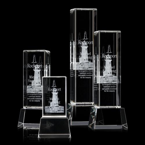 Brilliant thick Optical Crystal Tower with beveled edges is ideal for 3 Dimensional engraving with a tall vertical orientation and extra depth to allow for an intricate design. Available in Clear, Black or Blue Bases as well as freestanding. See associated items.