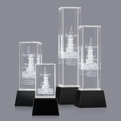 Brilliant thick Optical Crystal Tower with beveled edges is ideal for 3 Dimensional engraving with a tall vertical orientation and extra depth to allow for an intricate design. Available in Clear, Black or Blue Bases as well as freestanding. See associated items.