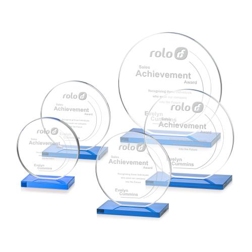 Our extraordinary cut Victoria Award features a flat edged Starfire disc mounted on an elegant sky blue crystal base to create a sleek award to recognize excellence.