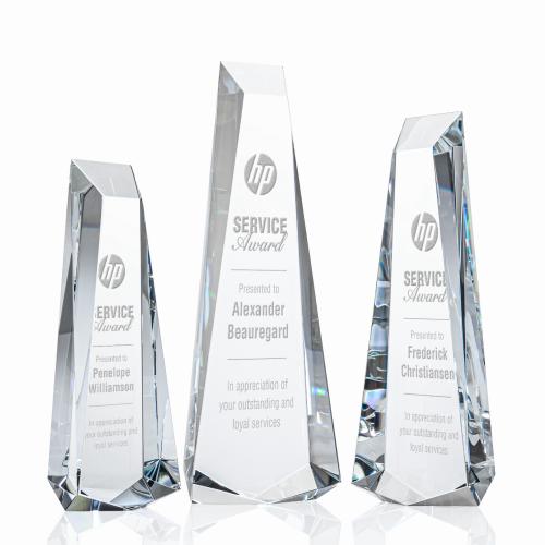 The Rustern Obelisk is a modern monument to optical crystal brilliance. With a sharp multifaceted base that continues through the beveled sides and top, this sparkling recognition sculpture is a sight to behold. Available in freestanding or with a clear or colored optical crystal base.