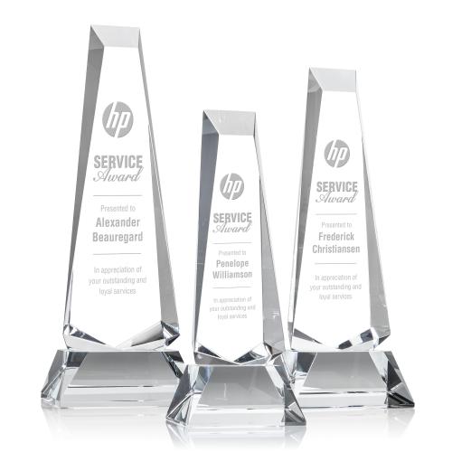 The Rustern Obelisk is a modern monument to optical crystal brilliance. With a sharp multifaceted base that continues through the beveled sides and top, this sparkling recognition sculpture is a sight to behold. Available in freestanding or with a clear or colored optical crystal base.