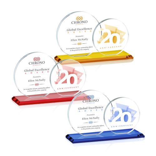 The Double Victoria Award features 2 opulent Starfire circles positioned on a dazzling Emerald Green, Sapphire Blue, Amber, Ebony, Ruby, White glass panel or albion base. Let your message POP with full color VividPrint!