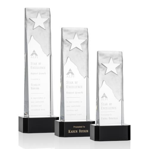 The Beautiful Optical Crystal Stapleton Star is a tall freestanding tower that features a deep hand carving effect that forms a sculptured frosted mountain top adorned with a brilliant optically clear star. Mounted on your choice of 4 distinct Clear or Colored Crystal Base. Second Position Etch Optional.