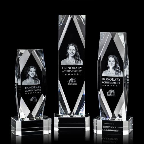 The majestic Optical Crystal Delta Dimensions 3D Award is perfect for recognizing an exceptional achievement. The deep faceted corners create a diamond-shaped window into your inspiring 3-dimensional message that illuminates with refracted light. Mounted on a bold optical crystal base. 2nd Position Etch Optional.